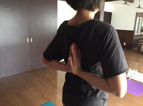 背中で合掌すると 奈良のヨガクラスlotus Shanti Yogaミヨサワリカ