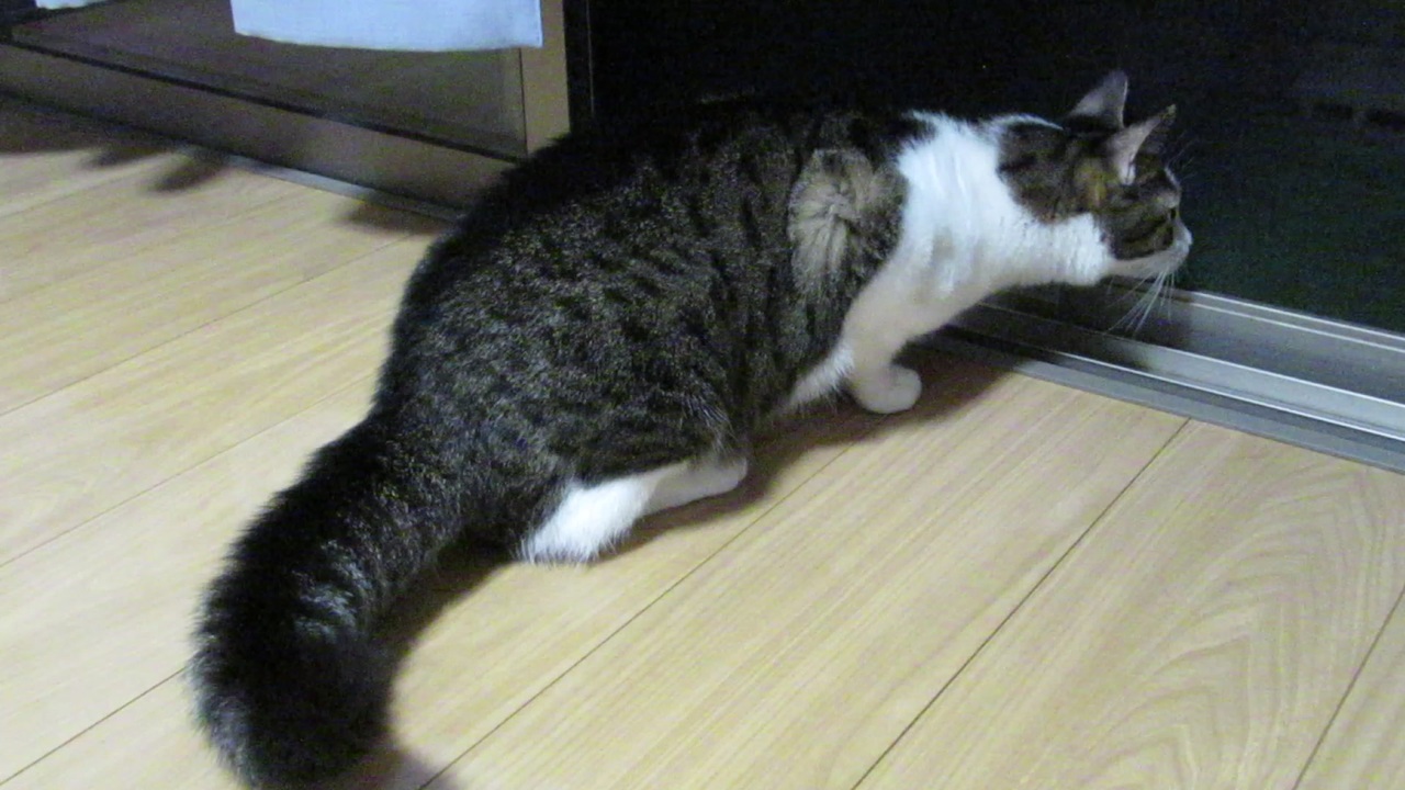 ごんぶと シッポの猫ちゃんが窓の外を警戒中 モッフモフに膨らんだ姿